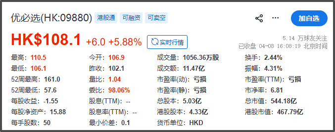 受此消息刺激,截至4月8日收盘,优必选股价应声上涨5.88%,报108.1港元/股,总市值544.18亿港元。