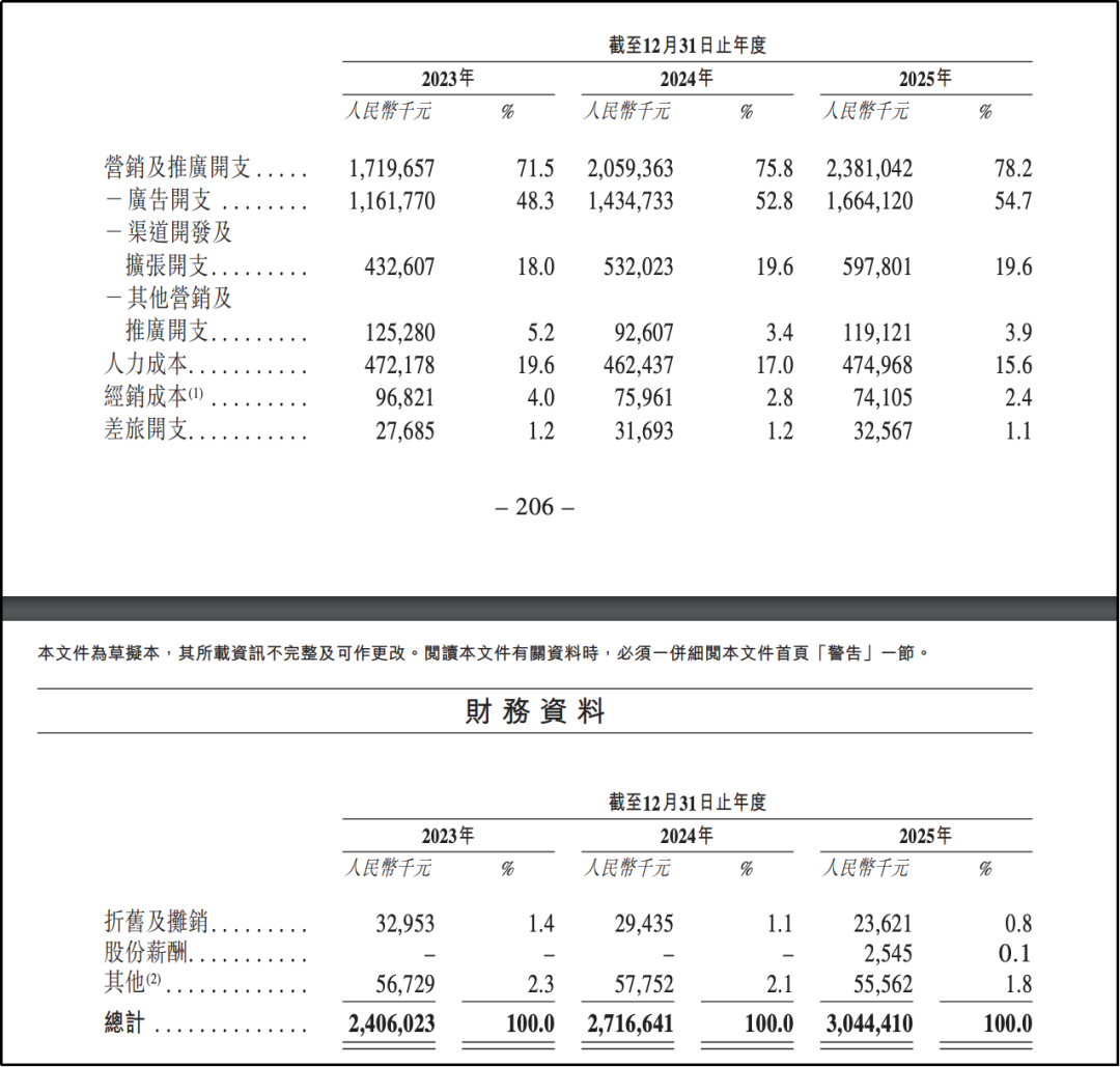 拆解营销成本可见,营销及推广开支是绝对主力,且占比逐年攀升:2023-2025年分别为17.19亿元、20.59亿元和23.81亿元,占营销总成本的比例从71.5%升至78.2%。其中,广告开支占比最高,各期分别达48.3%、52.8%和54.7%,主要用于明星代言、KOL直播、社交媒体推广及户外广告等;其次为渠道开发及扩张开支。