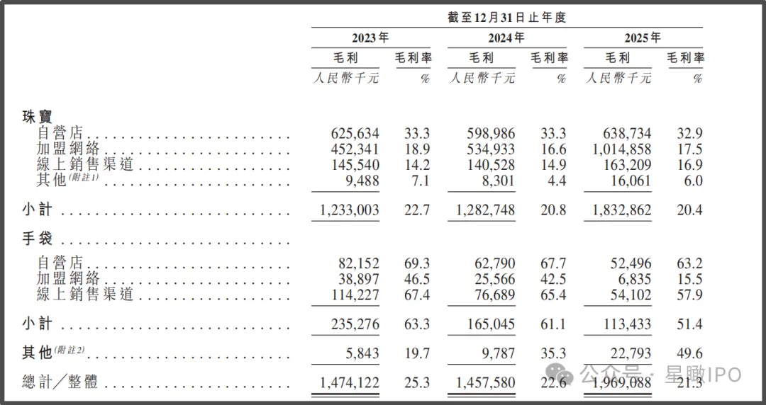 经营门店的变化反映在营收上,2025年,潮宏基加盟代理业务收入达57.96亿元,同比增长79.77%,占总营收比重从50%上升至62.21%。然而,加盟代理业务同期毛利率仅为17.5%,远低于自营渠道的32.9%,成为拖累整体毛利率的主因。