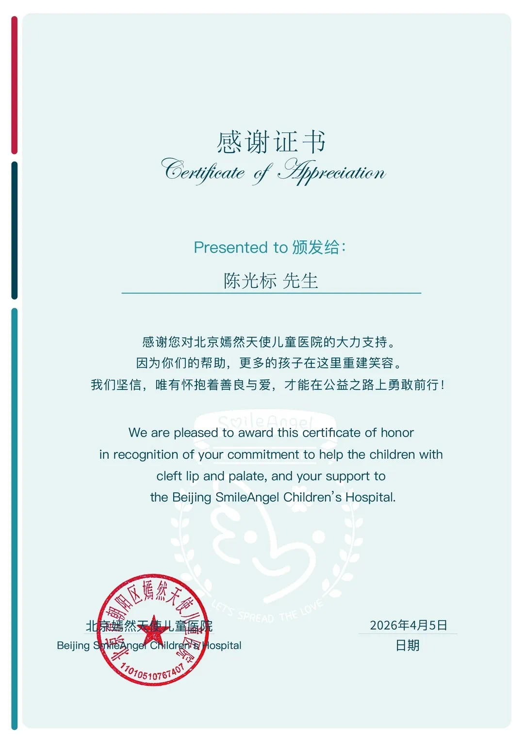 4月7日,“北京嫣然天使儿童医院体检中心”官方账号发布颁发给陈光标的感谢证书。