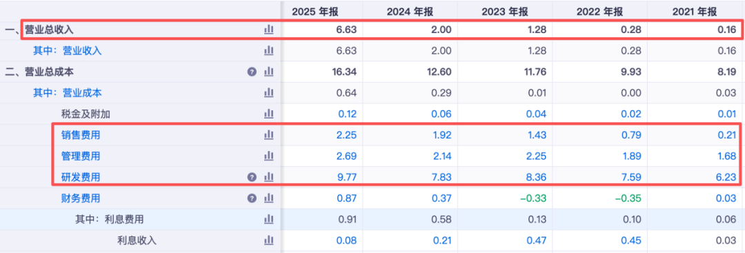 以最新财报为例,2025年迈威生物在总营收仅6.63亿元的情况下,仅销售费用、管理费用、研发费用三项成本总计已达14.71亿元,叠加其他成本费用后,最终2025年迈威生物归母净利润表现为亏损9.69亿元。