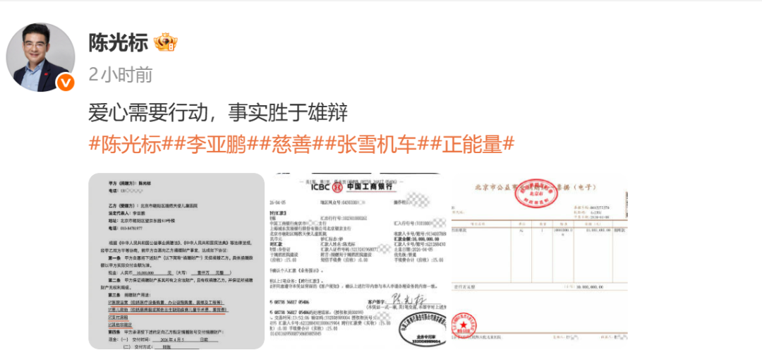 4月9日,李亚鹏在直播中针对陈光标向嫣然天使儿童医院捐赠1000万元一事作出最新回应。他澄清外界关于“捐款限定用途”的说法,确认该笔款项未设限制,全力支持医院运营。同时否认网上其“删除与陈光标的相关视频”的传闻,称从未发过双方相关视频。同时对陈光标的善举表达了感谢。