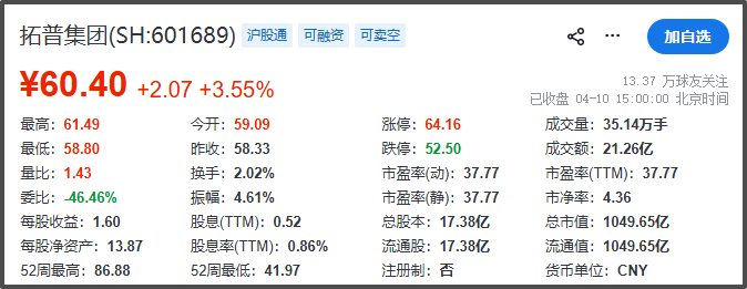 截至4月10日收盘,拓普集团A股报60.40元/股,上涨3.55%,总市值1049.65亿元。