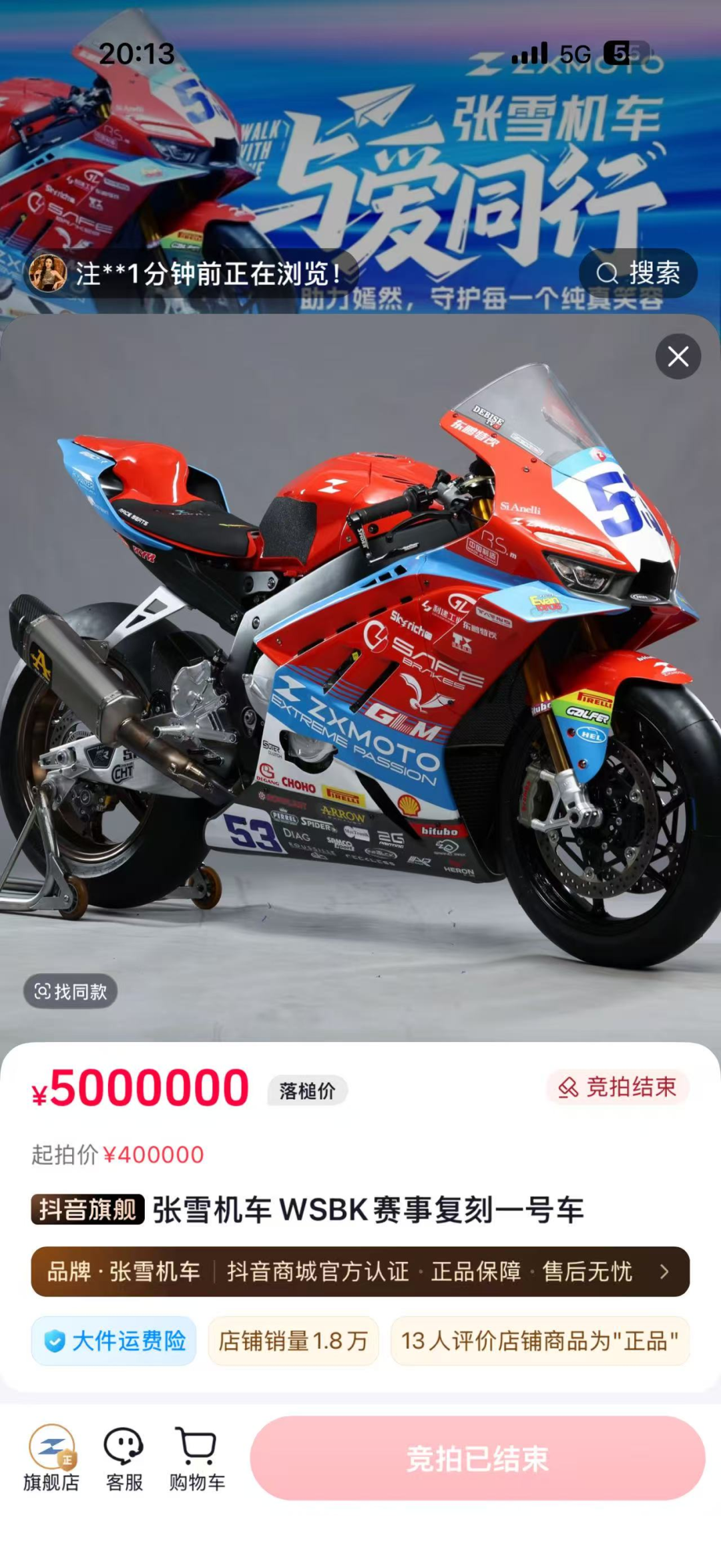 4月10日晚8时,张雪机车账号开启直播,开始拍卖WSBK夺冠车53号复刻版,据10日中午,张雪机车账号发布视频表示,此次拍卖夺冠车型复刻版,设置拍卖金额上限500万元。但竞拍者不能一次性出价到500万,在加价到100万以后,单次只能加价固定金额,因此谁能最先触达封顶价有一定的运气成分。