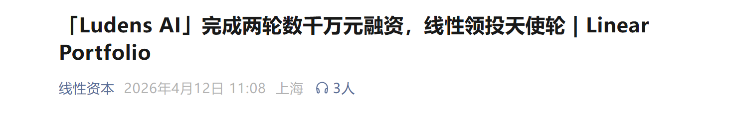 4月12日,据线性资本官微,陪伴机器人公司“Ludens AI”宣布已完成两轮数千万融资,天使轮由线性资本领投、清水湾基金跟投,天使+轮则由日本PKSHA Algorithm Fund和清水湾基金共同参投。