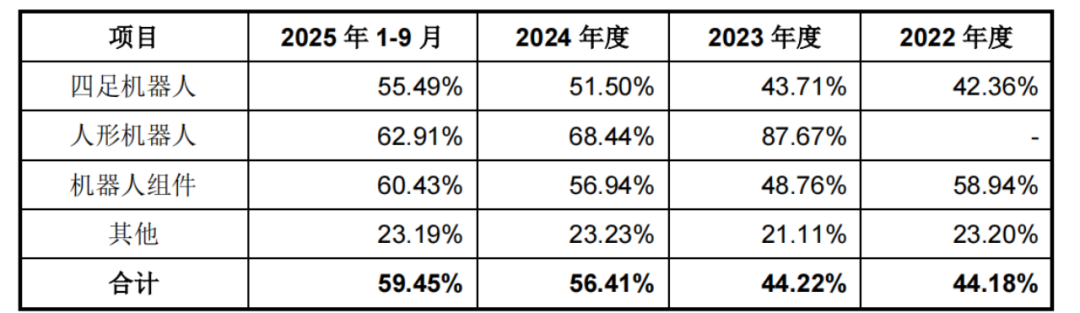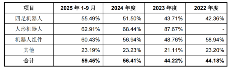 机器人畅销,宇树科技的盈利能力不断增强,报告期内,公司毛利率分别为44.18%、44.22%、56.41%及59.45%,呈逐年增长趋势。