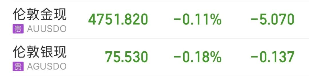 国际贵金属价格下跌,14日开盘,伦敦金现跌0.11%,报4751.82美元/盎司,伦敦银现跌0.18%,报75.530美元/盎司。
