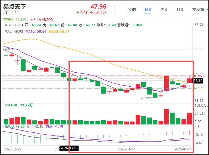 拉长时间维度来看,近一个月(3月13日至4月13日)易点天下股价区间涨跌幅为-6.59%,近20日收盘价整体呈现“高位回落、波动加大”的节奏,从48元附近逐步走弱至45元附近。