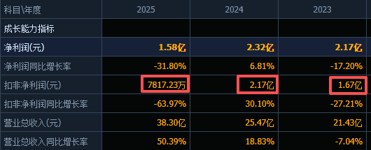 但利润端的变动同样不容忽视,与营收高增形成鲜明反差的是公司盈利能力的持续恶化。2023年至2025年易点天下净利润分别为2.17亿元、2.32亿元、1.58亿元,其中2025年同比下滑31.8%。扣非净利润的下滑更为剧烈,2025年仅为7817.23万元,同比锐减63.97%。