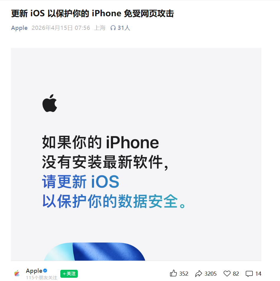 4月15日上午,苹果官微发文表示,安全研究人员最近发现,存在一些基于网页的攻击,它们会借助恶意网页内容,对过时版本的iOS发起攻击。