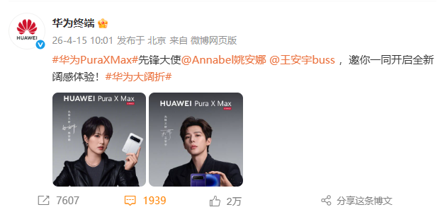 4月15日,华为终端正式官宣,姚安娜与王安宇将共同出任华为Pura X Max的先锋大使。