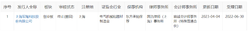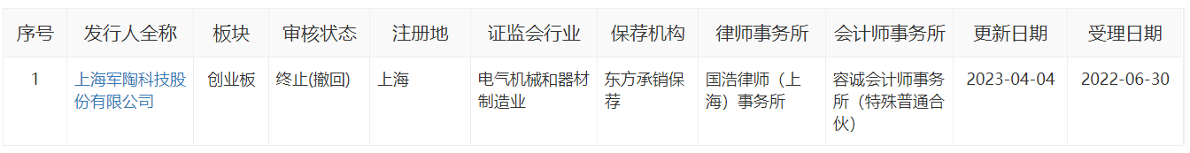 据悉,军陶科技曾于2022年6月30日申报创业板获受理,彼时保荐机构为东方证券、拟募资5.2亿元,2023年4月,公司首发被终止审核。