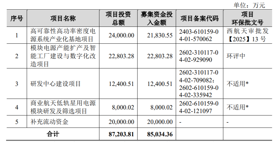 本次IPO,军陶科技拟募集资金投入金额8.5亿元,分别用于高可靠性高功率密度电源系统产业化基地项目、模块电源产能扩产及智能工厂建设与数字化改造项目、研发中心建设项目、商业航天低轨星用电源模块研发及筛选项目、补充流动资金。