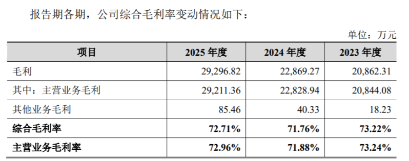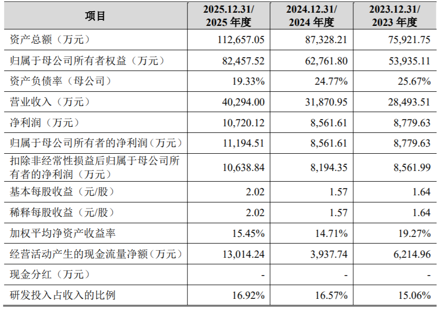 2023年至2025年(报告期内),公司营业收入分别为2.85亿元、3.19亿元和4.03亿元,归属于母公司股东的净利润分别为8779.63万元、8561.61万元和1.12亿元。