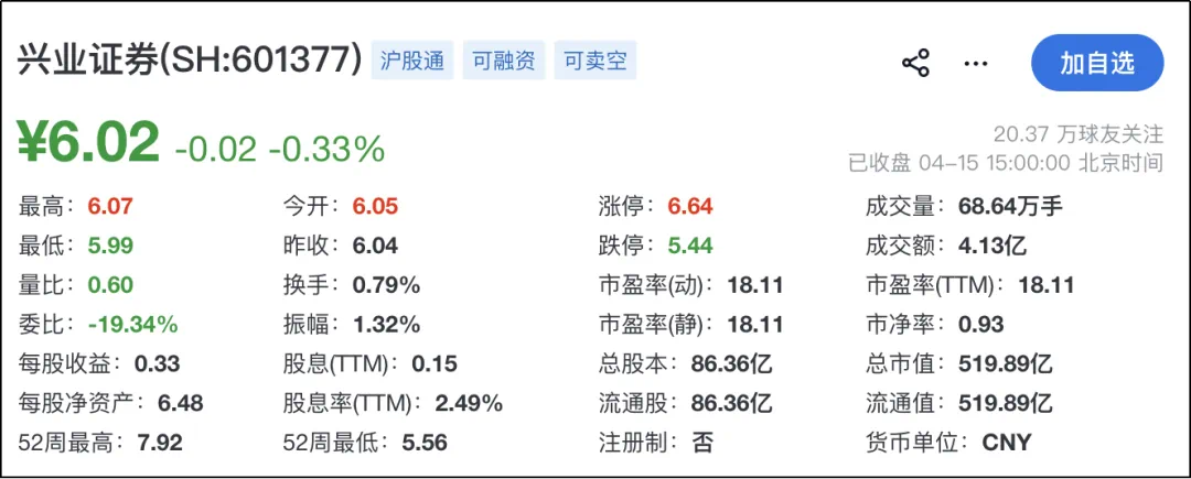 截至4月15日收盘,兴业证券报6.02元/股,下跌0.33%,总市值519.89亿元。