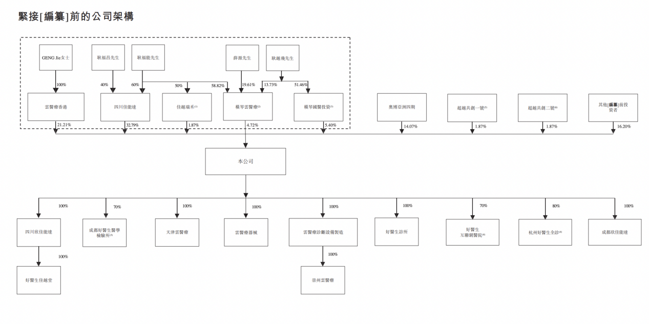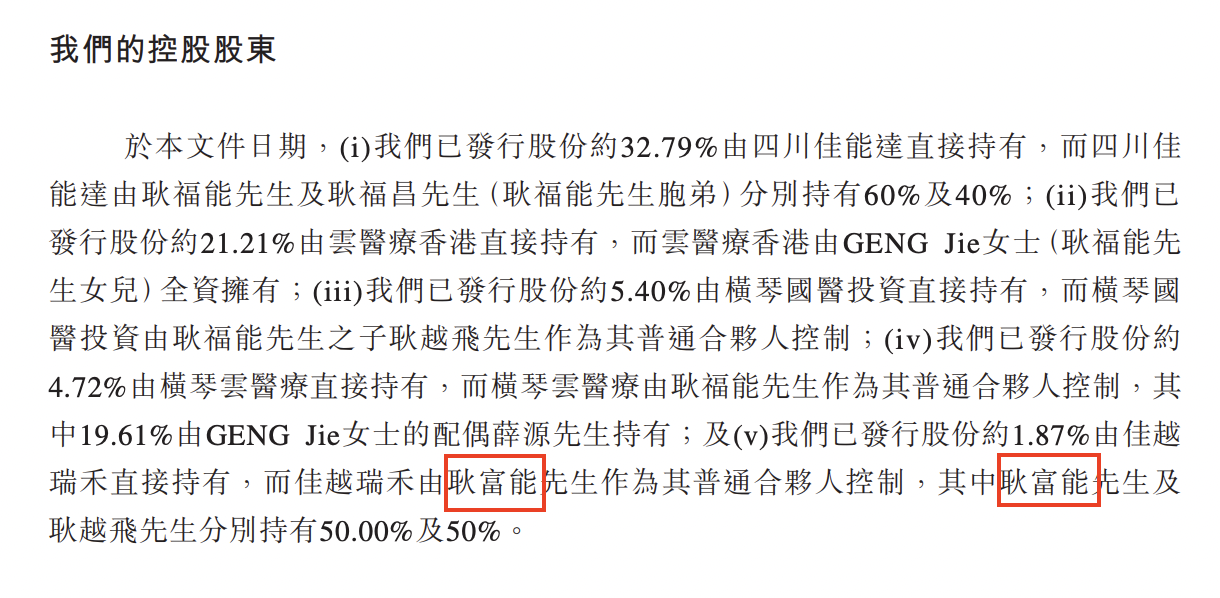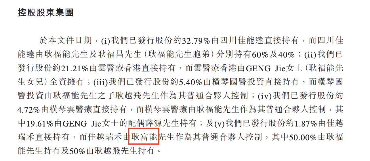 IPO前,GENG Jie、耿福能、耿福昌、耿越飞、薛源、四川佳能达、云医疗香港、横琴云医疗、横琴国医投资及佳越瑞禾共同有权控制于公司股东大会上约65.99%表决权的行使。
