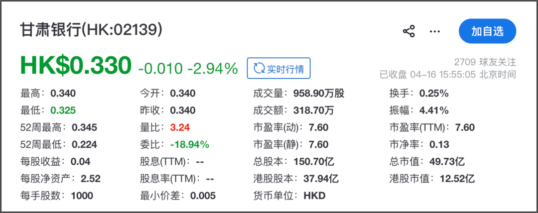 在递交第一期辅导报告的三个月前,甘肃银行已于2018年1月18日在香港联交所主板完成H股上市。截至4月16日收盘,该行报0.33港元/股,下跌2.94%,总市值49.73亿港元。