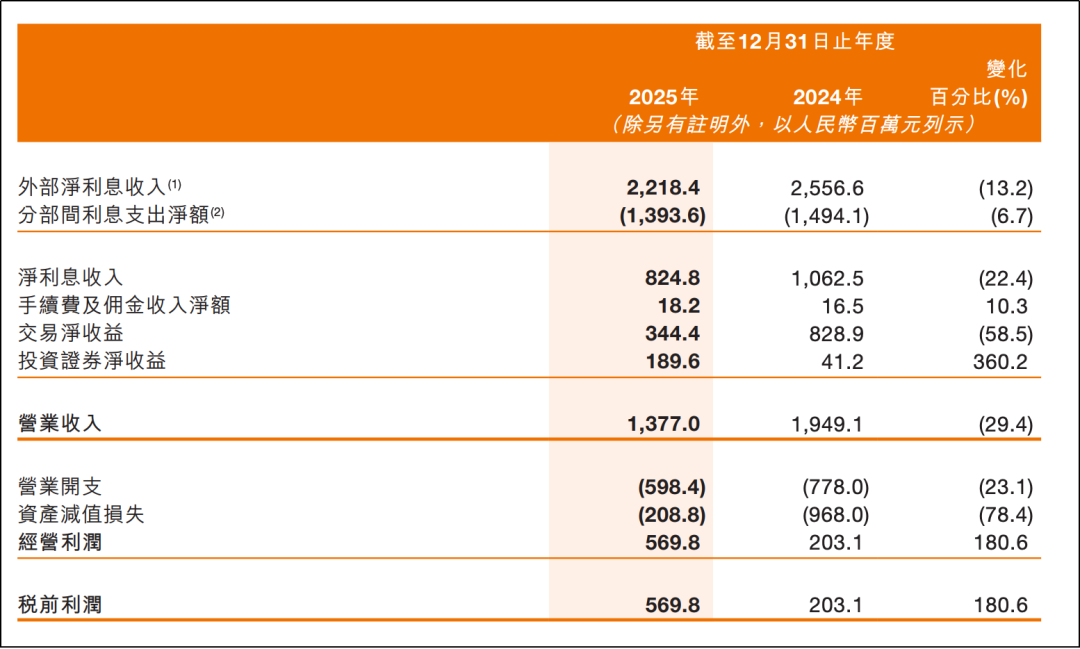 ▲金融市场业务数据,来源:甘肃银行2025年度报告具体来看,甘肃银行外部净利息收入同比直降13.2%,净利息收入同比下滑22.4%,交易净收益同比缩减近六成。尽管营业开支和资产减值损失金额有所下降,但仍未能弥补收入下滑的缺口。业内分析认为,2025年债券市场波动加剧,是导致银行金融市场业务收益下滑的重要行业因素。