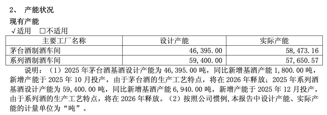 产能方面,贵州茅台表示,2025年茅台酒基酒设计产能为46395.00吨,同比新增基酒产能1800.00吨,新增产能于2025年10月投产,由于茅台酒的生产工艺特点,将在2026年释放;2025年系列酒基酒设计产能为59400.00吨,同比新增基酒产能6940.00吨,新增产能于2025年12月投产,由于系列酒的生产工艺特点,将在2026年释放。