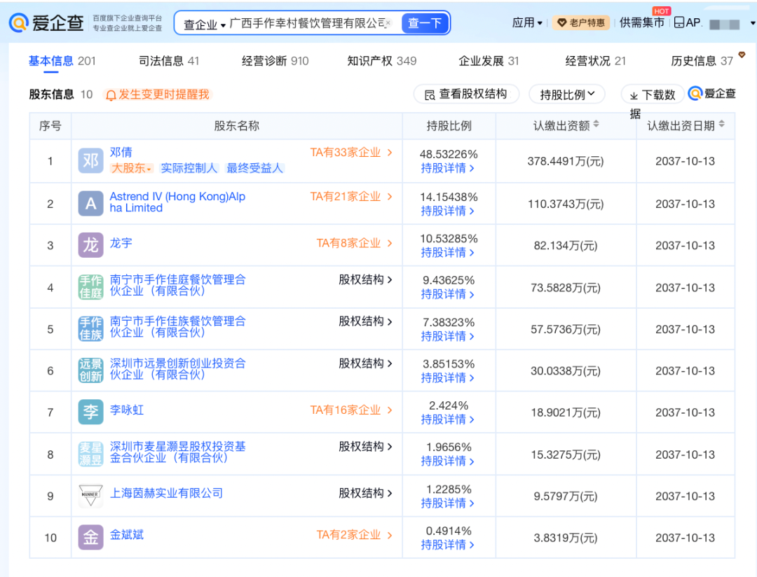 爱企查App显示,广西手作幸村餐饮管理有限公司成立于2017年10月,法定代表人为邓倩,注册资本约779.79万元人民币,经营范围包括餐饮服务、市场营销策划、农副产品销售等,由邓倩、南宁市手作佳庭餐饮管理合伙企业(有限合伙)、上海茵赫实业有限公司等共同持股。