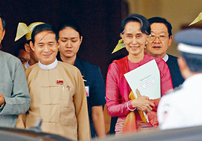 ▲温敏与昂山素姬一起步出国会。