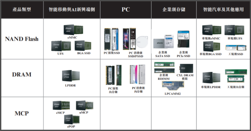 佰维存储主营DRAM(如LPDDR及DDR)、NAND Flash(如eMMC、UFS及SSD)以及多芯片封装(MCP,如uMCP、eMCP及ePOP)存储解决方案,产品应用在智能移动与AI新兴端侧、PC、企业级存储、智能汽车等多个领域。