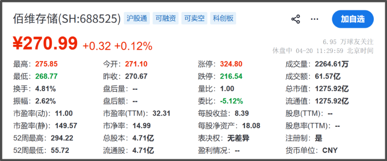 近两年,在AI浪潮的催化下,佰维存储的股价一路水涨船高,截至4月20日午市休盘,已涨至270.99元/股,较招股价上涨18倍,市值也膨胀20倍至1275.92亿元。