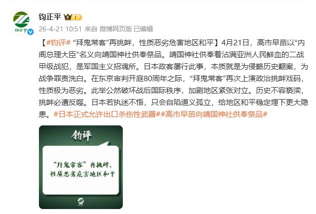 4月21日,“钧正平”发文,高市早苗以“内阁总理大臣”名义向靖国神社供奉祭品。靖国神社供奉着沾满亚洲人民鲜血的二战甲级战犯,是军国主义招魂所。日本政客屡行此事,本质就是为侵略历史翻案,为战争罪责洗白。在东京审判开庭80周年之际,“拜鬼常客”再次上演政治挑衅戏码,性质极为恶劣。此举公然破坏战后国际秩序,加剧地区紧张对立。历史不容亵渎,挑衅必遭反噬。日本若执迷不悟,只会自陷道义孤立,给地区和平稳定埋下更大隐患。