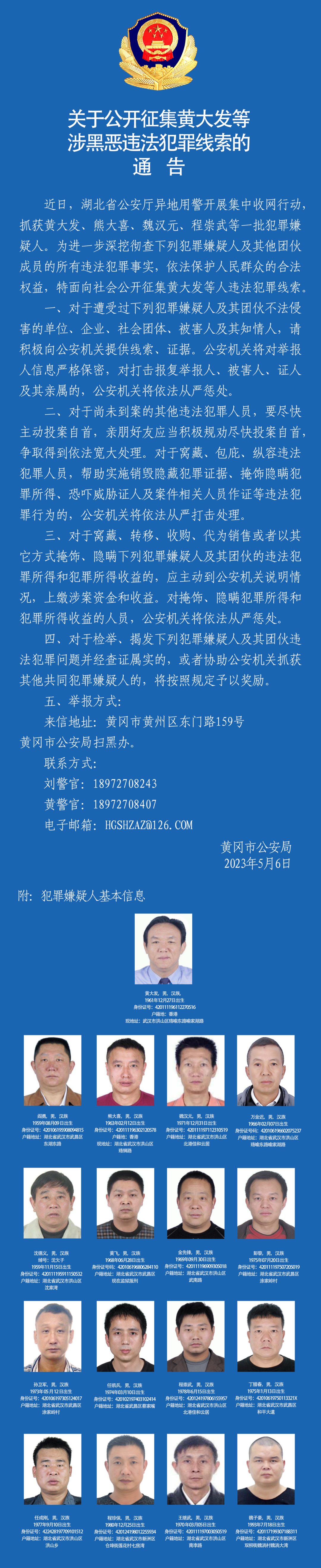 据法治日报和微信公众号“平安黄冈”此前消息, 2023年5月6日,湖北省黄冈市公安局对外发布通告,公开征集黄大发等涉黑恶违法犯罪线索。这意味着,盘踞湖北武汉多年、坊间传闻已久的“黑老大”黄大发已落网。