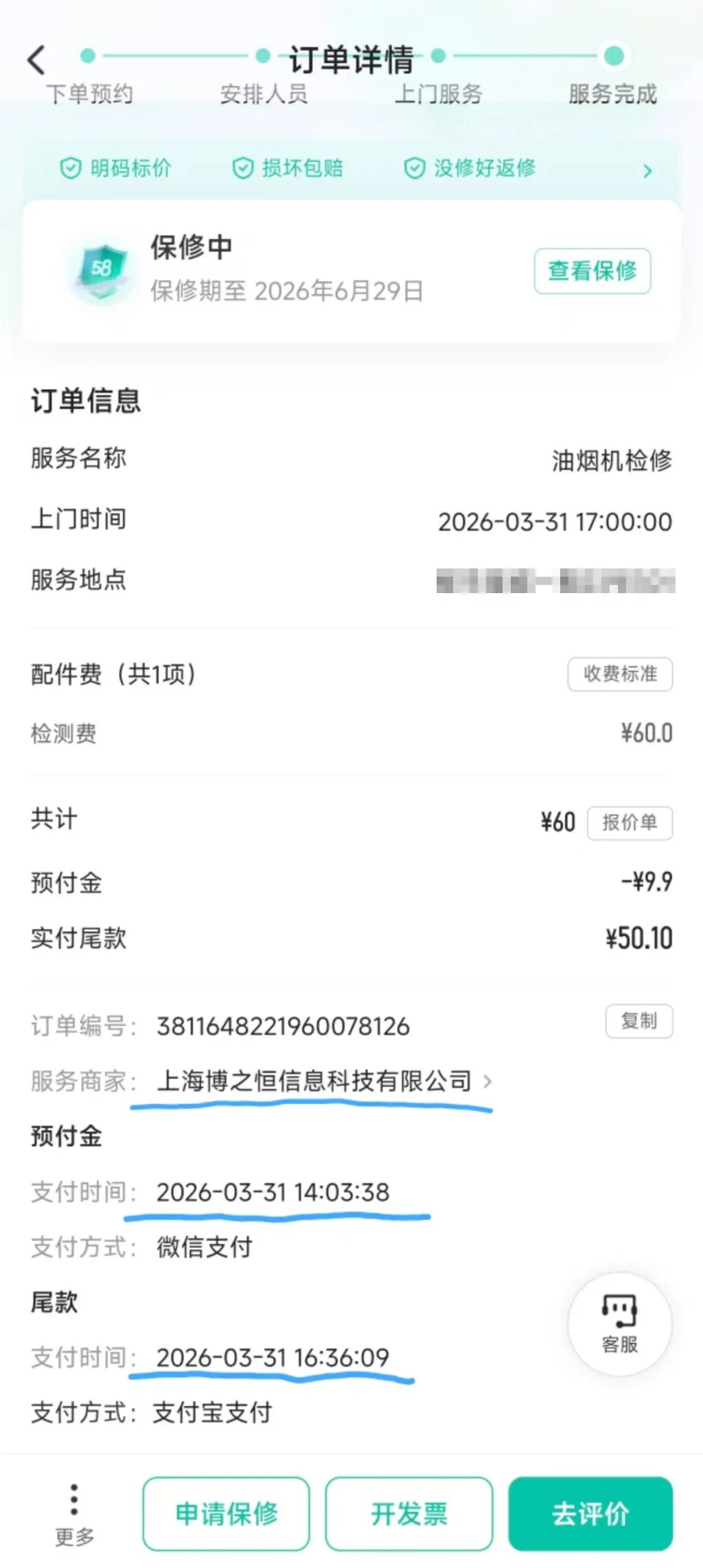 沈女士告诉记者,3月31日下午2点多,他在58同城APP下单,给住在闵行区的父母维修油烟机,在平台上“询问报价”后,她下了个订单。在她账号“我的订单”中,该订单的服务商家为:上海博之恒信息科技有限公司,检测费约60元,预付款9.9元。
