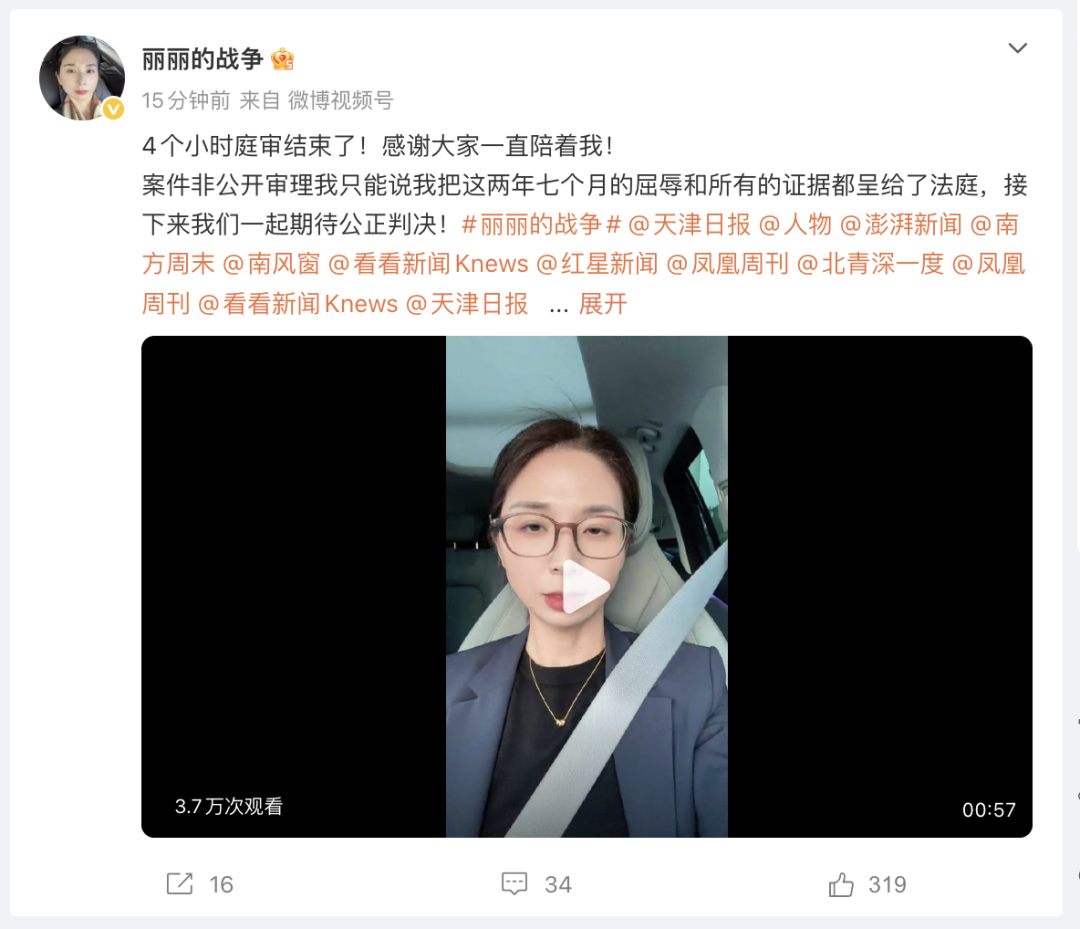 傍晚7点左右,崔丽丽通过个人微博表示:“4个小时庭审结束了!感谢大家一直陪着我!案件非公开审理,我只能说我把这两年七个月的屈辱和所有的证据都呈给了法庭,接下来我们一起期待公正判决!”