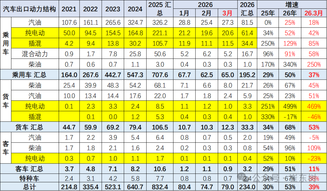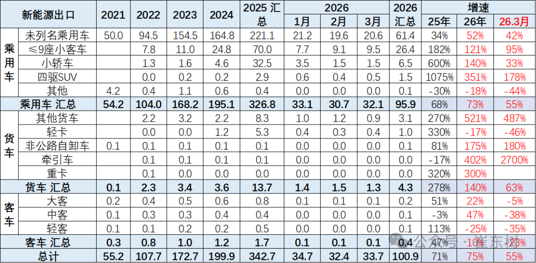 2024年全年中国纯电动车型出口168万辆、增6%;2025年中国纯电动车出口232万辆、增38%;2026年1-3月中国纯电动车出口65万辆、增59%,3月增长47%也是很好的。