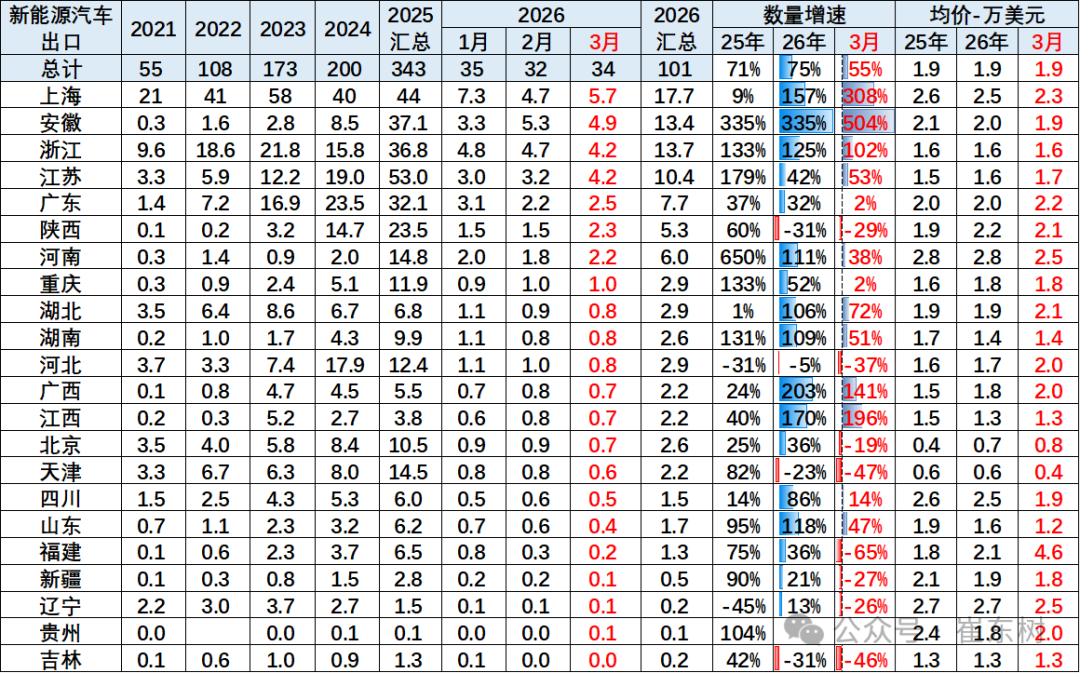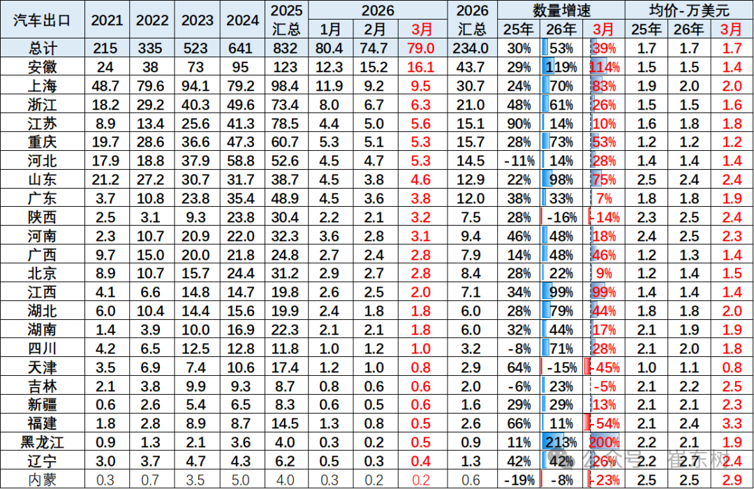2024年开始上海出口的全国汽车龙头地位被安徽替代,2026年安徽仍保持出口第一的地位。上海对中国出口的重要意义极其明显,实际是长四角的龙头,辐射效应强。2026年1-3月安徽汽车出口44万辆,这主要是由于安徽本地的企业相对比较优秀,加之比亚迪等企业落户合肥。上海企业出口档次高,上汽乘用车和特斯拉两家企业,出口均价较高。