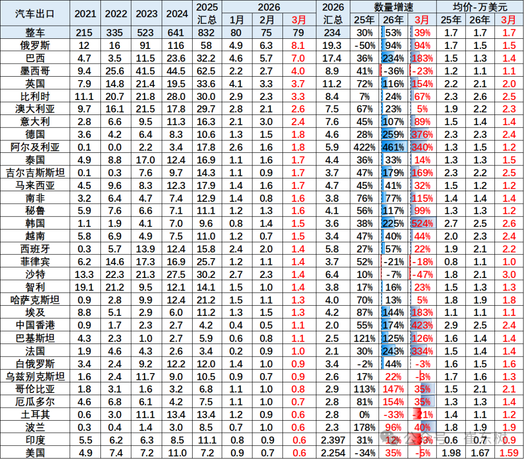 2026年1-3月中国汽车实现出口234万辆,同比2025年同期增速53%,3月中国汽车实现出口79万辆,同比增39%,环比增6%,同比走势总体较强, 环比受到中东影响而偏低。今年的主要动力仍是中国产品竞争力提升和全球南方国家市场的小幅增长,俄罗斯车市贡献较大。
