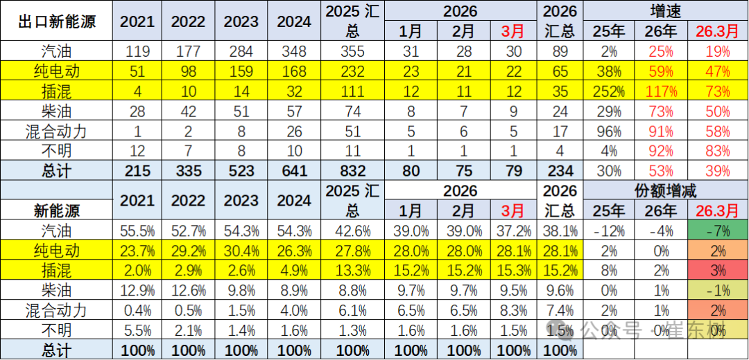 2026年3月中国汽车出口中纯电动占比28%(同比增2%),插混占比15%(同比+3%),混动占比8%(同比+2%),纯燃油车占比37%(同比-7%)。