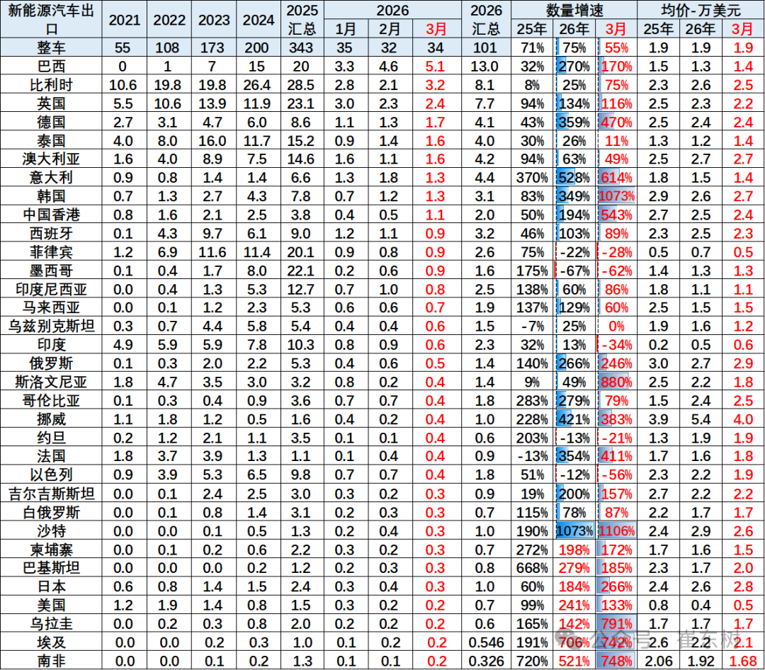 2026年1-3月中国新能源汽车出口总量的前10国家:巴西129706辆、比利时80634辆、英国76493辆、阿联酋49151辆、意大利43702辆、澳大利亚42193辆、德国40745辆、泰国39659辆、西班牙32331辆,其中本期较同期增量增大的前五个是:巴西94574辆、英国43759辆、意大利36740辆、德国31805辆、阿联酋25747辆。