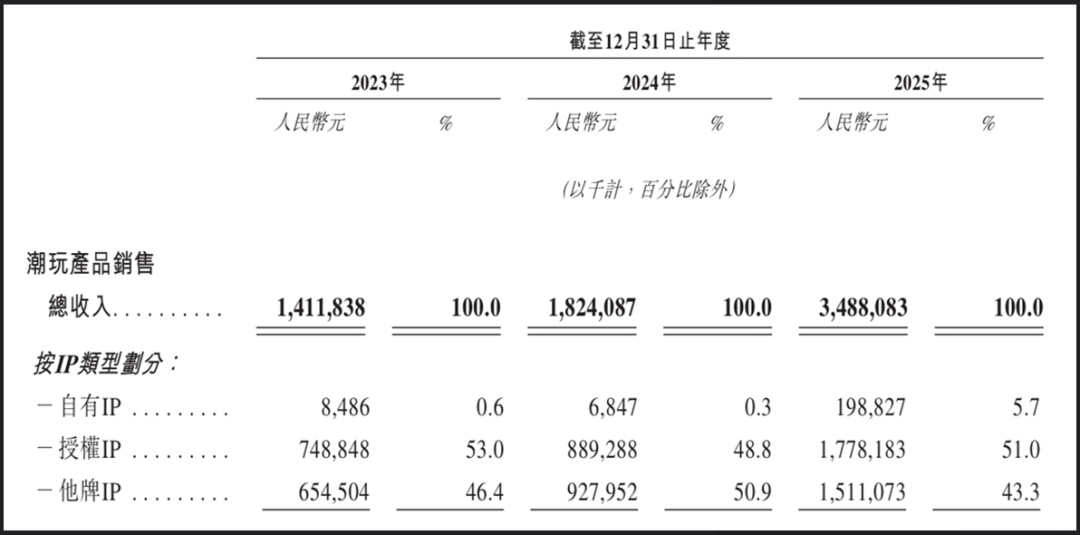 2023—2025年,公司潮玩产品销售总收入从14.12亿元增长至34.88亿元,年复合增长率57.17%;其中,自有IP销售收入从848.6万元增至1.99亿元,年复合增长率高达384.26%,但2025年占总收入仅有5.7%。