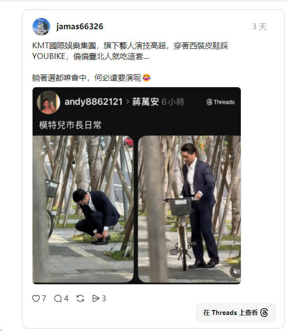 近日社群平台Threads上流传台北市长蒋万安身着西装骑乘YouBike的画面,还有网友酸“模特儿市长的日常”。对此,台北市研考会主委殷玮也透露真相,甚至还有人去检举此事,但其实这是公益影片,市长受一个大型国际民间团体邀请拍摄,用于宣传相关活动与台北市政形象。