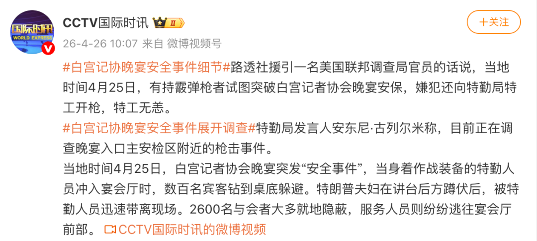 路透社援引一名美国联邦调查局官员的话说,当地时间4月25日,有持霰弹枪者试图突破白宫记者协会晚宴安保,嫌犯还向特勤局特工开枪,特工无恙。
