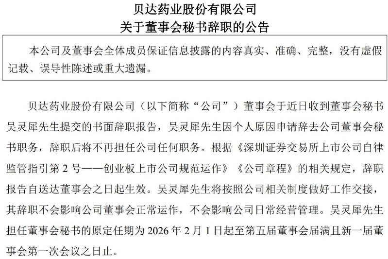 资料显示,吴灵犀自2019年7月起担任贝达药业董事长助理,自2020年9月起担任董事会秘书,其董事会秘书原定任期为2026年2月1日起至第五届董事会届满且新一届董事会第一次会议之日止。截至公告披露日,吴灵犀直接持有贝达药业5.996万股股份。