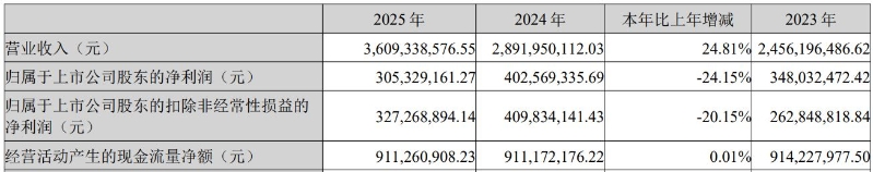 回顾2025年全年,贝达药业的业绩则呈现出“增收不增利”的局面。年报财务数据显示,2025年公司实现营业收入36.09亿元,同比增长24.81%,延续了增长态势。然而,归母净利润却仅为3.05亿元,同比下降24.15%;扣非归母净利润3.27亿元,同比下降20.15%。