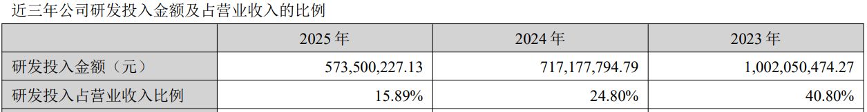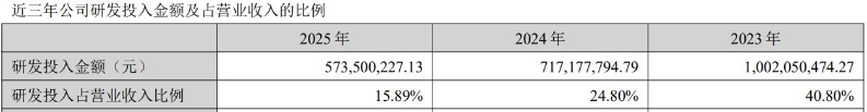 值得注意的是,贝达药业研发投入连续两年缩减。年报显示,2023年至2025年,贝达药业研发投入金额分别为10.02亿元、7.17亿元和5.74亿元,占营业收入比例从40.80%降至15.89%。