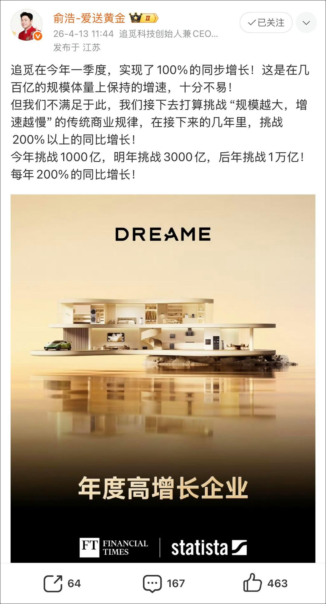 业绩方面,4月13日,俞浩发文表示,追觅在今年一季度实现了100%的同步增长,接下去打算挑战“规模越大,增速越慢”的传统商业规律。“今年挑战1000亿,明年挑战3000亿,后年挑战1万亿!每年200%的同比增长!”俞浩写道。