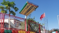 九龙塘金巴伦道和界限街交界的方方乐趣英文小学,原本悬挂在校外的长方型招牌,不知何故如打后空翻般向后反,架在上方的栏杆上。