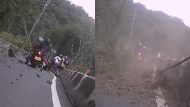 惊悚影片曝光:山区"大片土石"崩落,摩托车司机护头逃命